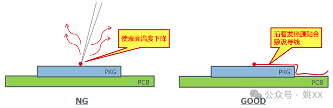 除了热电偶测量端(连接端)的固定方法外,导线的处理也会影响测量结果。导线需要沿着封装本体敷设到PCB。这种走线方法具有“减少导线散热带来的热电偶连接处的温降”的效果。这一点在JEDEC Standard中也作为一种布线技巧有提及。也就是说,如何更大程度地减少热电偶的散热量,是准确测量表面温度的关键。