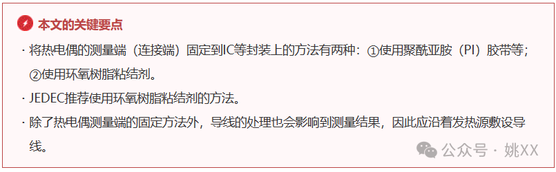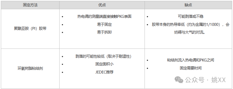 将热电偶的测量端(连接端)固定到IC等封装上的方法有两种:①使用聚酰亚胺(PI)胶带等;②使用环氧树脂粘结剂。JEDEC推荐使用环氧树脂粘结剂的方法。