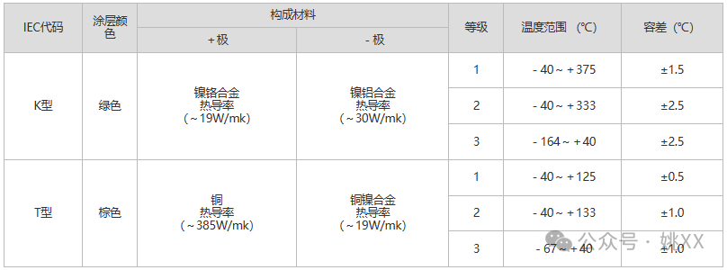 热电偶(IEC标准热电偶)分为很多种类,用B、R、S、N、K、E、J、T、C型等符号来表示。每种热电偶都都其可测量的温度范围和特性特点。下表中列出了K型和T型热电偶的特点,这两种通常多用于测量电子元器件和设备等的温度。