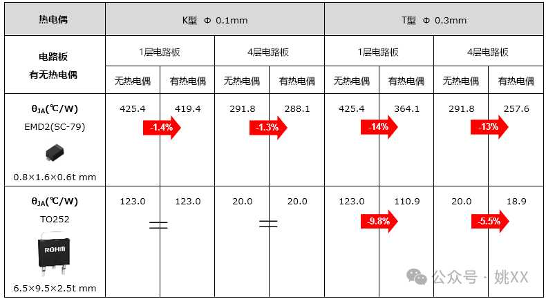 下表是使用Φ 0.1mm的K型和Φ 0.3mm的T型两种热电偶,对0.8×1.6×0.6t mm这种非常小的封装和6.5×9.5×2.5t mm这种封装的半导体器件,进行温度测量,并获得热阻θJA值的测试结果汇总。电路板分别使用了1层和4层两种类型。