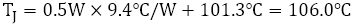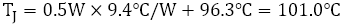 从数据可以看出,当元器件距离很近时,θJA和ΨJT均上升,但θJA的波动较大,不能用于TJ的估算。当然,ΨJT也有波动,但由于其值原本就小,波动也很小,因此即使用于TJ的估算也不会造成太大的误差。例如,使用一个元器件时的ΨJT=9.4℃/W,计算两个相邻状态下的TJ时,结果如下,与实际温度101.5℃相比,误差在1%以内。