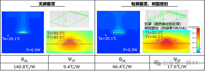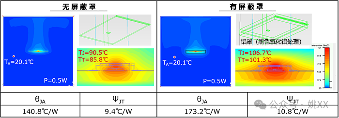 出于EMC对策等原因,目标器件可能会有使用屏蔽罩覆盖的情况。下面是使用和不使用屏蔽罩时实测的θJA和ΨJT结果比较。