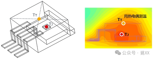 ΨJT表示相对于器件整体的功耗P的、结点与封装顶面中心之间的温度差的热特性参数。下图是表示TJ和TT的示意图。由于TT是封装顶面中心处的温度,因此可以在实装设备的实际工作状态下使用热电偶等进行测量。