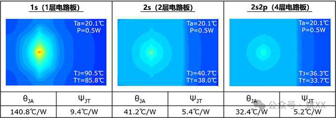 随着电路板层数的增加,θJA显着下降,但即使在这种情况下,θJA也不能用于TJ的计算。ΨJT的波动也很大,作为示例,使用1s(1层电路板)时的ΨJT=9.4℃/W,计算2s2p(4层电路板)时的TJ,结果如下。