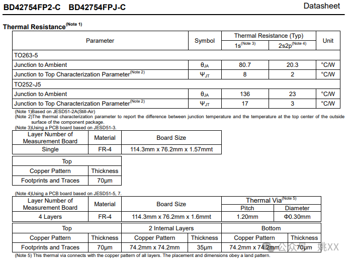 这款IC有两种封装,因此提供了每种封装(TO263-5、TO252-J5)的热阻。顺便提一下,这两种封装都是带散热片的电源系统5引脚表贴型封装。