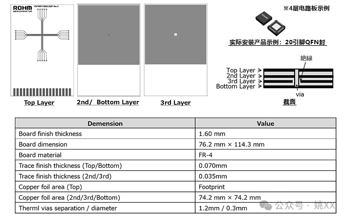 此外,还给出了每种热阻在两种电路板条件下的值,一种是安装于1层电路板上,另一种是安装于4层电路板上。1层电路板如Note 3所示是符合JESD51-3的电路板,4层电路板是符合JESD51-5和7的电路板(Note 4)。表中列出了每种电路板的条件。