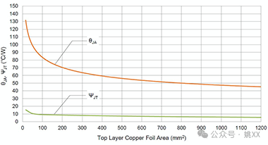 右图表示电路板表层铜箔面积与θJA和ΨJT之间的关系。θJA受铜箔面积(即流入PCB的热量)的影响很大,而ΨJT由于器件的大部分热量都会流入PCB,因此TJ-TT间的温差非常小,故ΨJT的值和变化也都很小。由于θJA会因实装电路板的条件不同而有很大变化,因此很难直接用于估算TJ,但ΨJT不会因PCB的差异而有较大变化,所以是可以使用的。