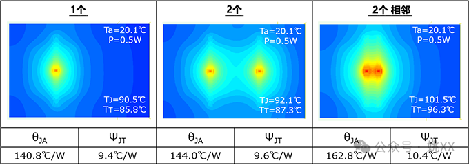 虽然应该避免这种情况,但在元器件实际安装过程中产生热量的元器件还是可能会彼此相邻。下面是两者具有适当的距离(中间图)时和它们彼此相邻(右图)时的θJA和ΨJT结果比较。