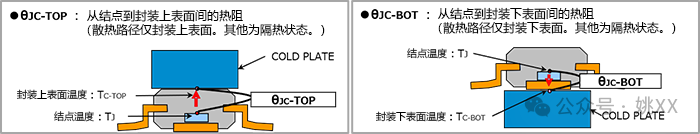 此外,还定义了结点与封装上表面之间的热阻θJC-TOP和结点与封装下表面之间的热阻θJC-BOT,如下图所示。请注意,θJC-TOP和ΨJT之间存在细微差别,即“封装上表面”和“封装上表面中心”的差异。