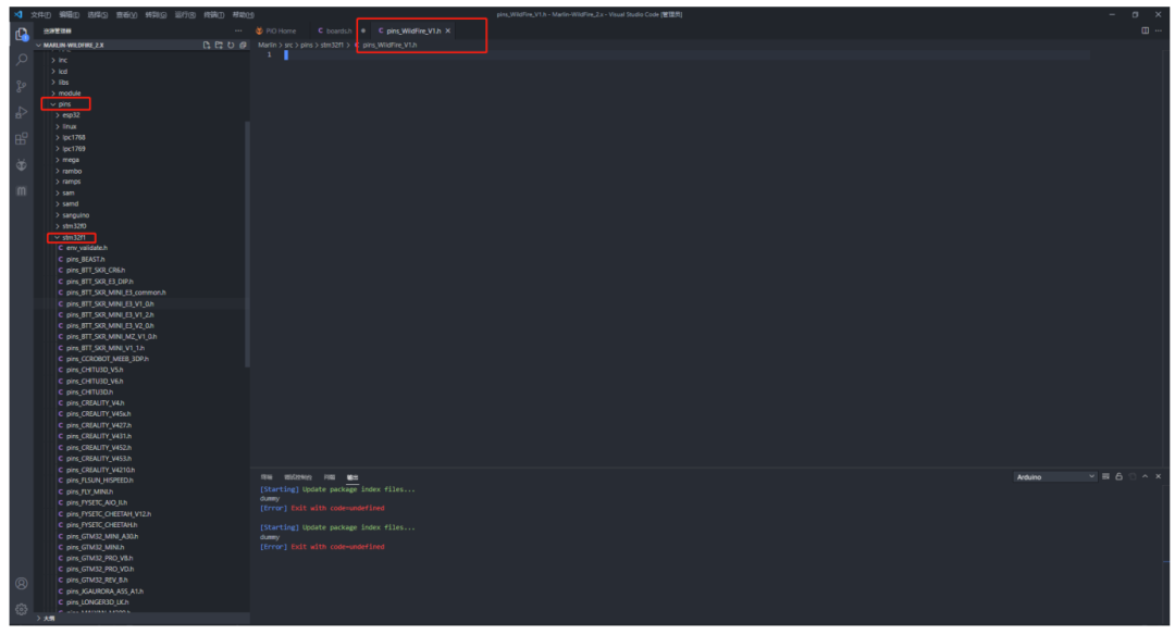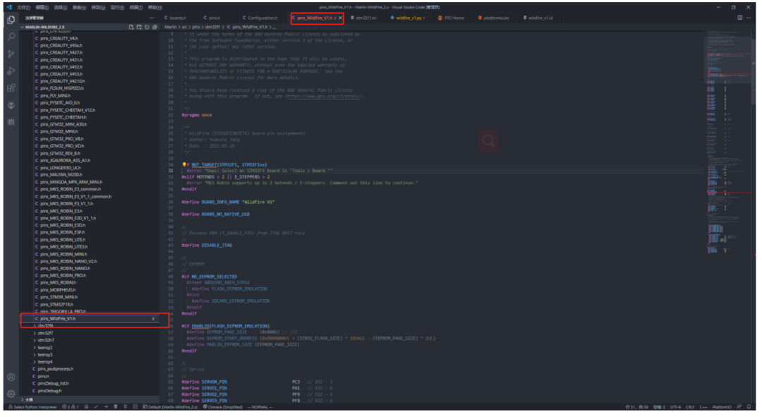 由于野火的这款开发板是 STM32F1 系列,Marlin已经做了相应的支持,所以我们直接在这个上面这个路径下创建一个文件 pins_WildFire_V1.h ,然后找到这个目录下另外一个相同芯片相似的引脚配置文件复制过来即可,接下来的工作就是修改管脚: