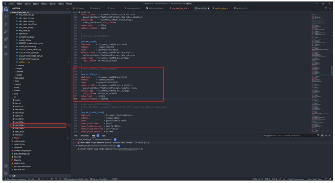 由于 Marlin2.0 已经支持 STM32F1 系列,也为 STM32F1 系列编写了相应的 ini 配置文件,我们只需要参考这个文件里的配置脚本,然后照葫芦画瓢即可。