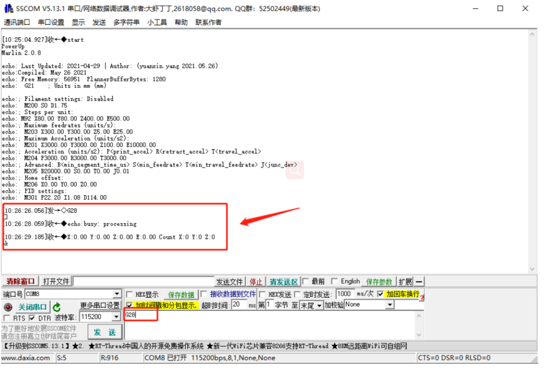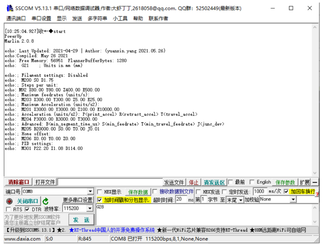 打开串口调试助手,可以看到有Marlin固件的信息输出了: