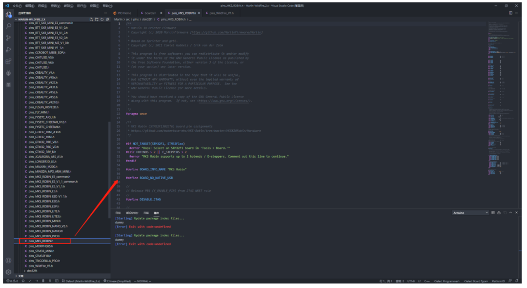 在前面我们看到,Marlin固件支持的一款MKS_ROBIN的主控芯片就是 STM32F103ZET6 ,所以我们找到这款芯片的引脚分配文件,然后将这个文件里的所有代码复制到 pins_WildFire_V1.h 中去: