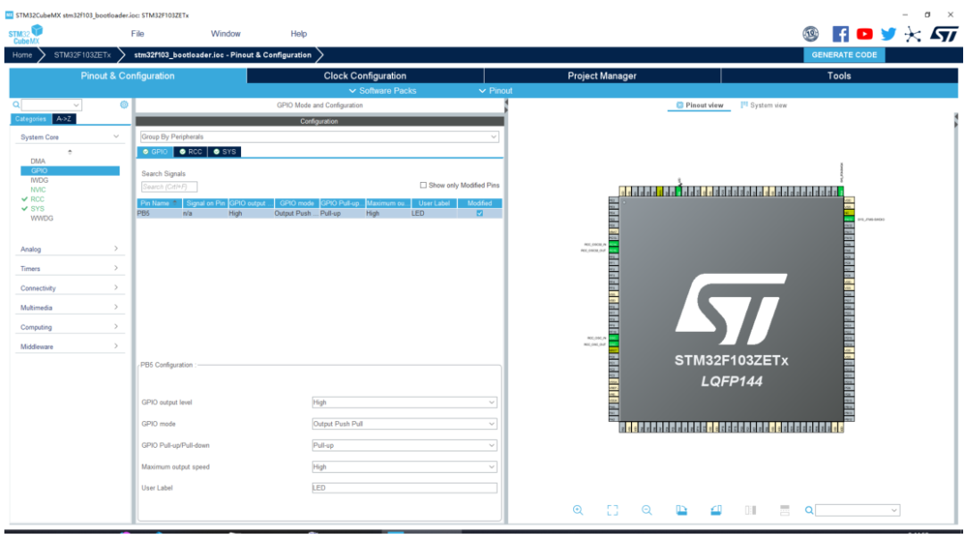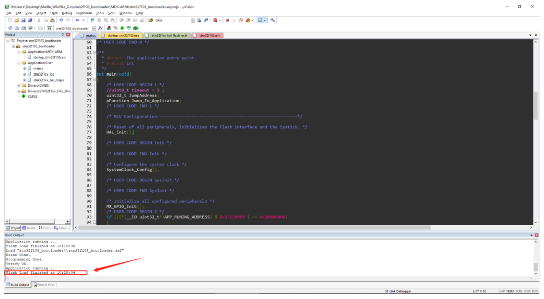/*** @brief The application entry point.* @retval int*/int main(void){/* USER CODE BEGIN 1 *///uint8_t timeout = 3 ;uint32_t JumpAddress;pFunction Jump_To_Application;/* USER CODE END 1 *//* MCU Configuration--------------------------------------------------------*//* Reset of all peripherals, Initializes the Flash interface and the Systick. */HAL_Init();/* USER CODE BEGIN Init *//* USER CODE END Init *//* Configure the system clock */SystemClock_Config();/* USER CODE BEGIN SysInit *//* USER CODE END SysInit *//* Initialize all configured peripherals */MX_GPIO_Init();/* USER CODE BEGIN 2 *///判断在0x8007000区域有没有APP,如果有则跳转到APP代码区if (((*(__IO uint32_t*)APP_RUNING_ADDRESS) & 0x2FFE0000 ) == 0x20000000){__disable_irq();HAL_DeInit();HAL_RCC_DeInit();JumpAddress = *(__IO uint32_t*) (APP_RUNING_ADDRESS + 4);Jump_To_Application = (pFunction) JumpAddress;__set_MSP(*(__IO uint32_t*) APP_RUNING_ADDRESS);Jump_To_Application();}/* USER CODE END 2 *//* Infinite loop *//* USER CODE BEGIN WHILE */while (1){/* USER CODE END WHILE *//* USER CODE BEGIN 3 *///如果没有APP,则会进入死循环,LED灯以300ms交替闪烁HAL_GPIO_TogglePin(LED_GPIO_Port, LED_Pin);HAL_Delay(300);}/* USER CODE END 3 */}
