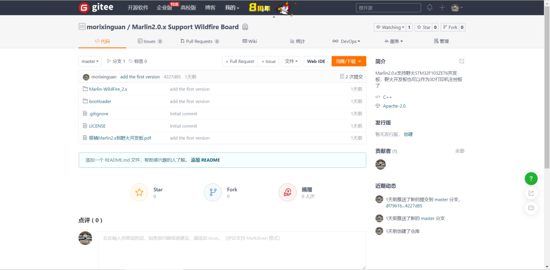 git clone https://gitee.com/morixinguan/marlin2.0.x-support-wildfire-board.git