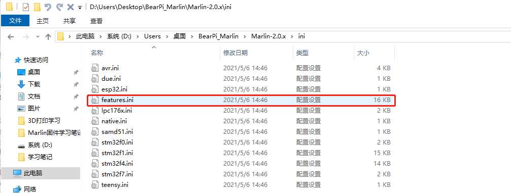 包含按 MCU 类型组织的所有 PlatformIO 环境设置, platformio.ini 文件将这些引入为 PlatformIO 提供构建/上传/调试设置,有一个文件特别有用:即是Marlin自定义构建脚本 features.ini 在构建开 始时用于根据启用的功能过滤源文件,因此构建能够完成得更快。