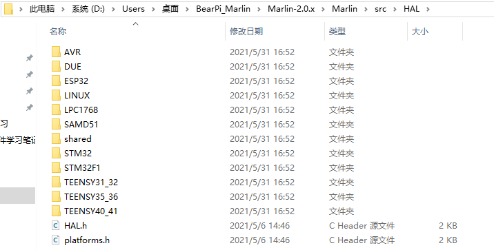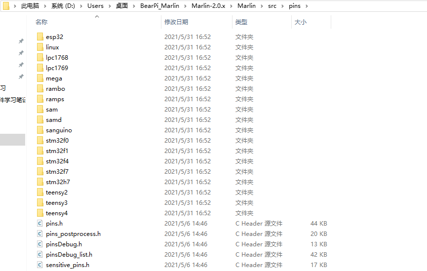 Marlin所有的板定义都在这个文件夹中,这里有不同的硬件架构,每个架构下的每块板都有自己独 特的引脚文件, pins.h 根据 MOTHERBOARD 设置进行包含,由于 pins.h 是 MarlinConfig.h 的包 含文件注意,因此它不会包含在其它的地方。
