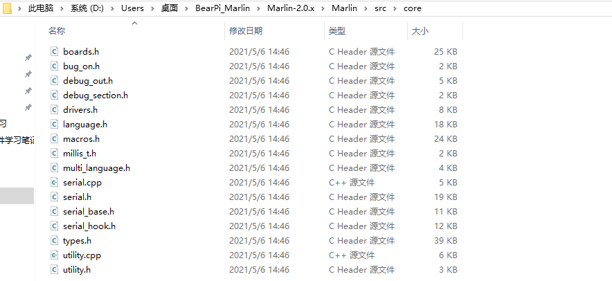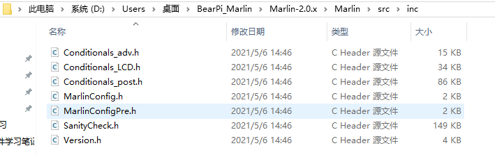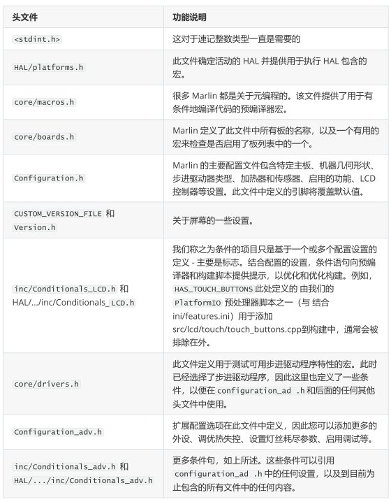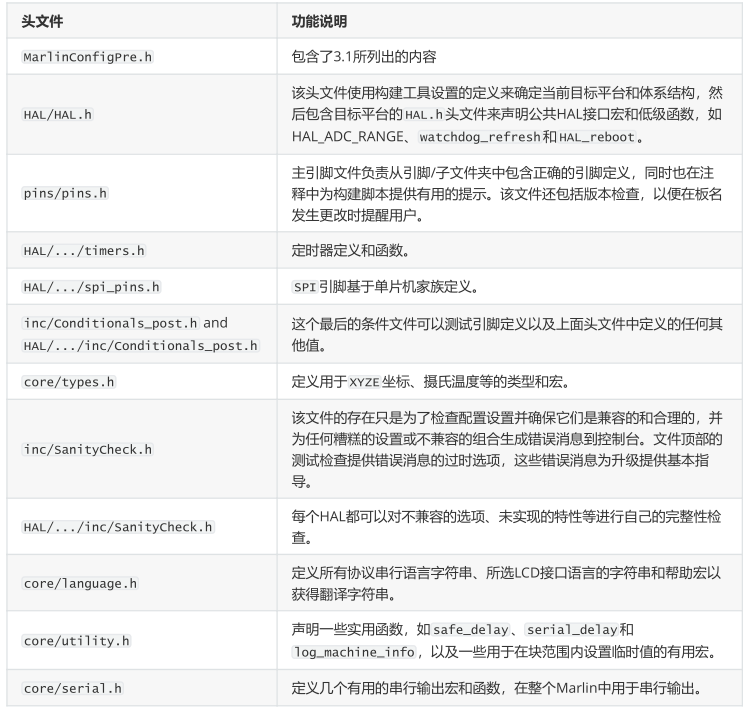 包含Marlin源文件需要的类型、宏、使用程序功能等等,大多数源文件只需要包含 inc/MarlinConfig.h 就可以确保这些文件按预期顺序包含在内。