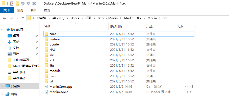 Marlin应用源代码主要由以上文件夹组成,核心的入口程序文件是 MarlinCore.cpp ,MarlinCore.h 会做一些宏和变量以及函数的声明,在这个文件中可以找到基于 Arduino 框架的 setup() 和 loop() 函 数,其余的文件夹包含的源码主要的作用如下: