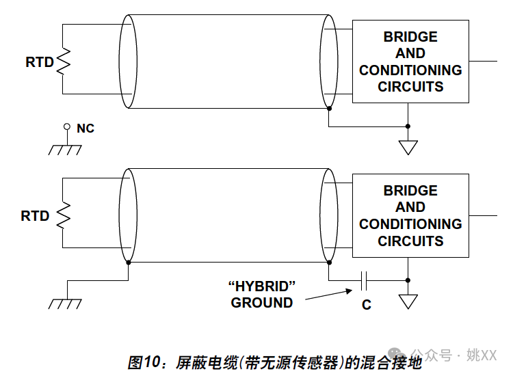 图10所示为远程无源RTD传感器通过屏蔽电缆连接到电桥和调理电路。正确的接地方式如图中上部所示,其中屏蔽体在接收端接地。