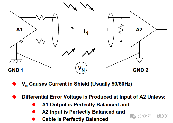 只要两个系统A1和A2相距较远,各系统的地电位(即VN)通常都存在差异。此电位差的频率通常为线路频率(50或60 Hz)及其倍数。但是,如果屏蔽体按照图中所示两端都直接接地,那么屏蔽体中会出现噪声电流IN。在完美平衡的系统中,系统的共模抑制能力无穷大,因此这一电流不会在接收器A2处产生任何差分误差。然而,驱动器、其阻抗、电缆和接收器中永远不可能实现完美平衡,因此会有一部分屏蔽电流以差分噪声信号形式出现在A2的输入端。下面针对各示例说明屏蔽体正确接地方式。
