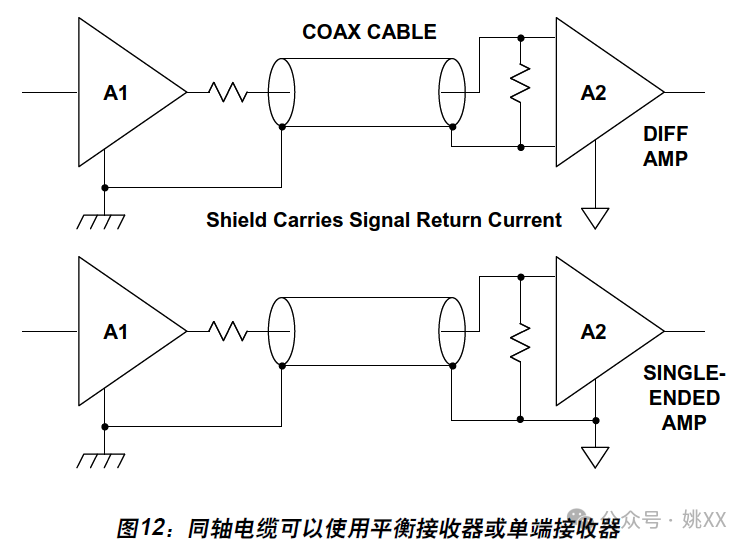 然而,接收器可能是单端类型,如标准单运放型电路中的典型元件。图12中的下部示例就是如此,因此这种情况下就必须将同轴电缆屏蔽体两端都接地。