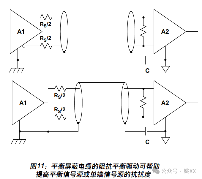图11所示为使用有源远程传感器和/或其它电子器件的情况。这两种情况下,无论是平衡驱动器(上部)还是单端驱动器(下部),混合接地都同样适合。两种情况下,电容"C"会断开低频接地环路,同时为图中右侧A2接收端的屏蔽电缆提供有效的射频接地。