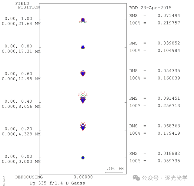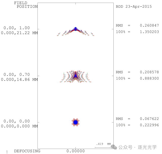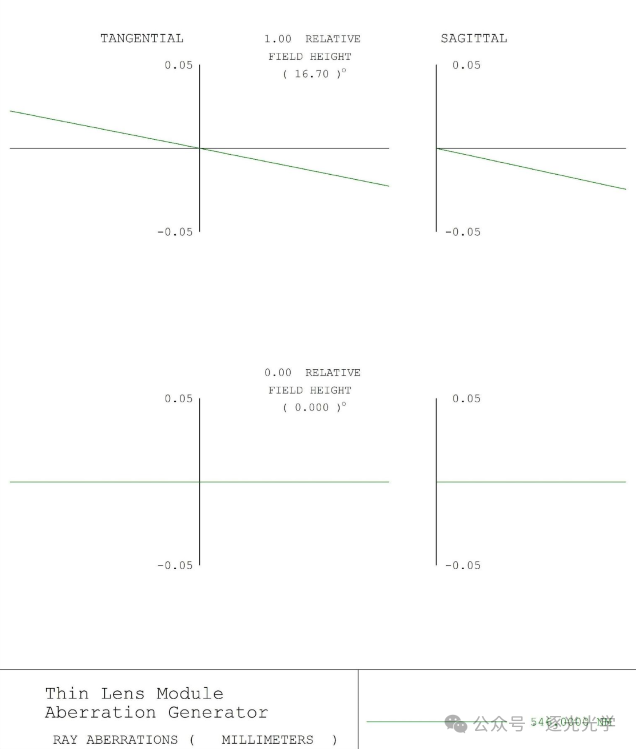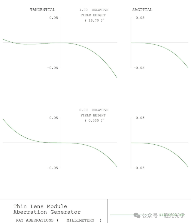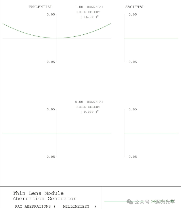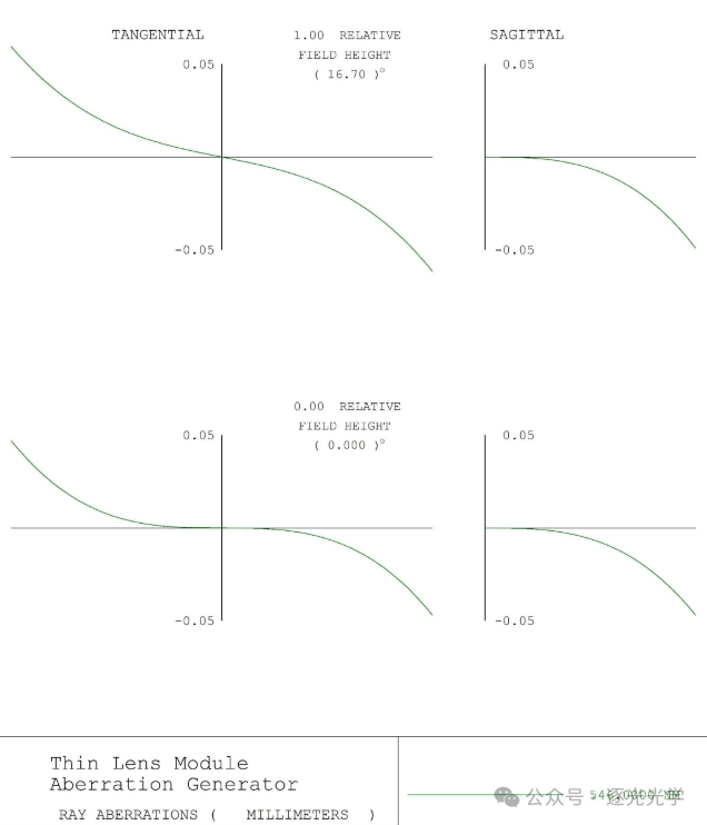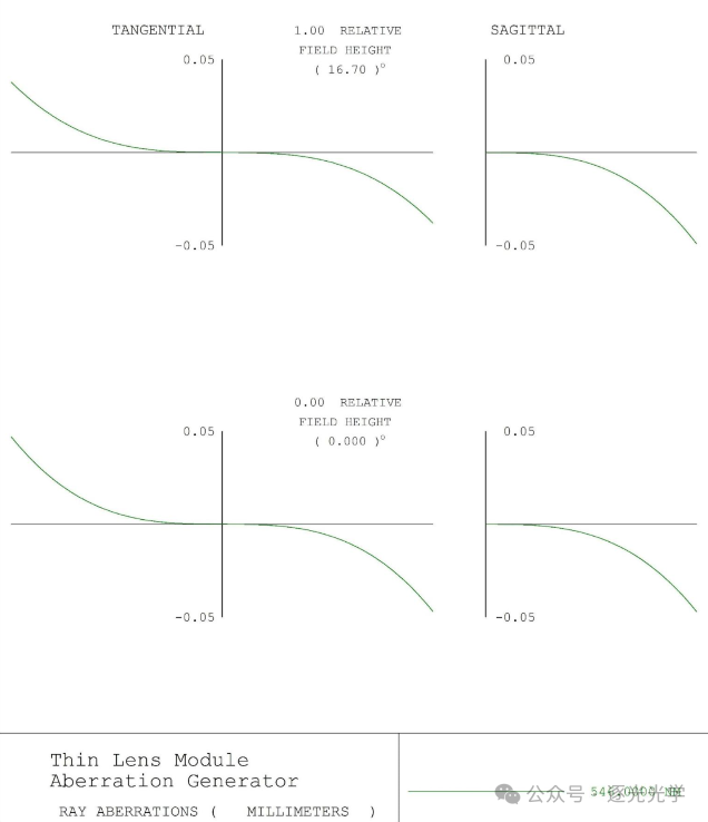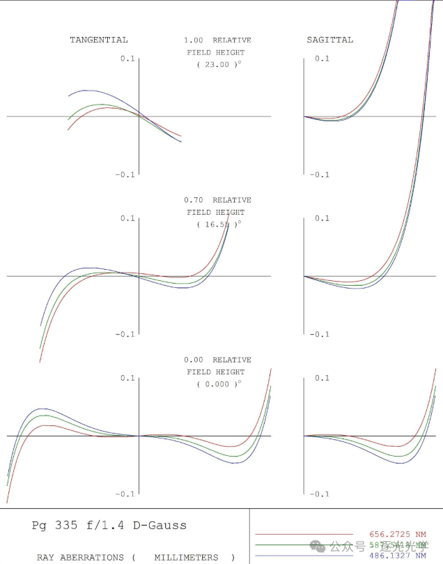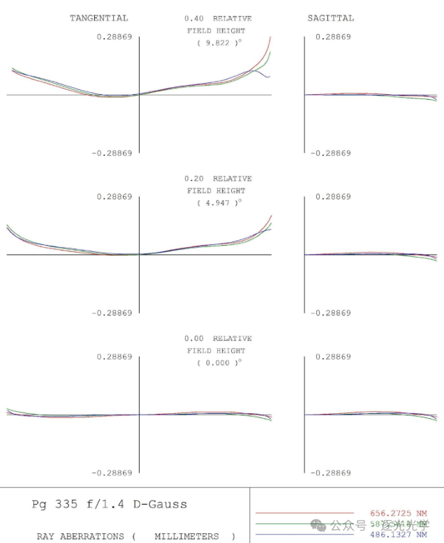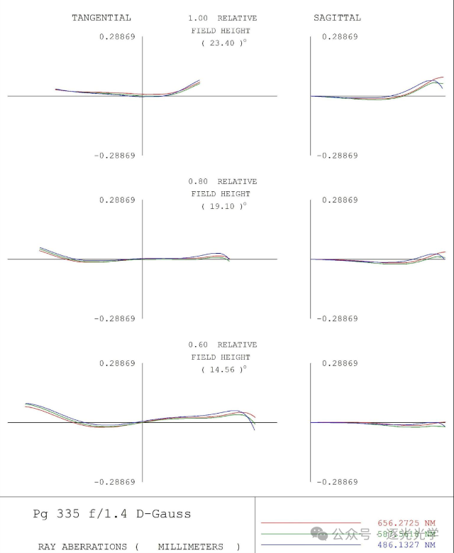 对这些图的一些解释是必不可少的。水平轴和垂直轴的交点是通过镜头出瞳中心到图像平面的光线。如果它错过了,则存在瞳孔像差,但这是另一个话题。右侧和左侧分别是通过瞳孔上侧和下侧的光线。符号约定是一致的,光线“向上”错过为正号,光线“向下”错过为负号,因此预计球差会产生圆形模糊,光线会向相反方向错过(因此,画出一个圆)。轴向色差发生在不同波长在图的原点相交(即形成一个X)但有不同的斜率,而横向色差发生在它们不在原点相交时。