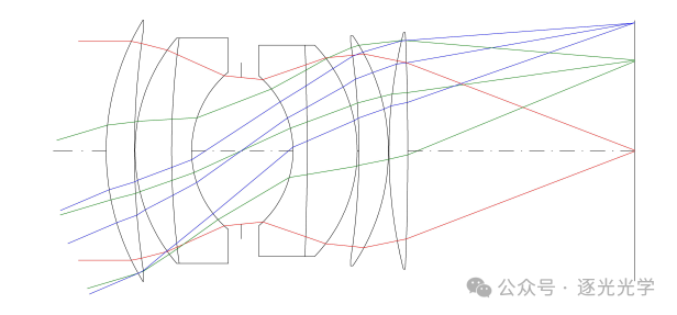 理论介绍完毕,现在是时候讨论一个镜头了。图10是一个真实镜头的例子,50mm f/1.4设计。其专利可在《现代镜头设计》第335页找到。