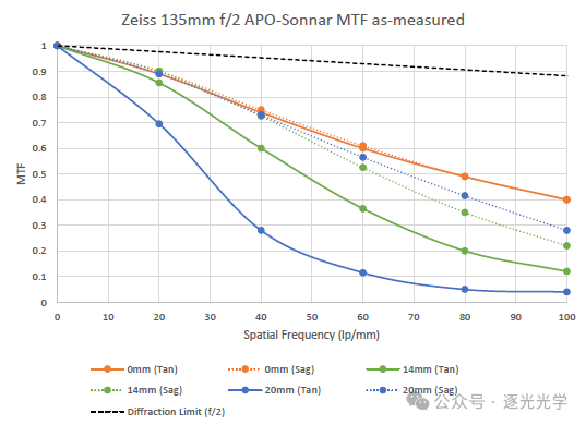 在这个135mm镜头的情况下,我们可以观察到分辨率在边缘下降,但主要是在切向图像平面。这可能表明镜头存在散光现象。散光在镜头设计中被认为是纵向和切向平面的视场曲率(Petzval)不同。这里切向平面相当平坦,而切向平面弯曲,使得边缘无法与中心对焦一致。参考制造商的MTF曲线,对于f/2,显然可能有两种情况:一种是通过将样本镜头安装在MTF测试台(如用于生成此数据的ImageMaster)或Optikos LensCheck测试台上生成曲线,结果来自中间焦点或最小散光焦平面;另一种情况是蔡司通过视场曲率补偿来生成其MTF曲线。