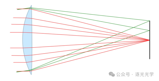 图2 – 红色表示光线高度变化,绿色表示图像高度或视场变化