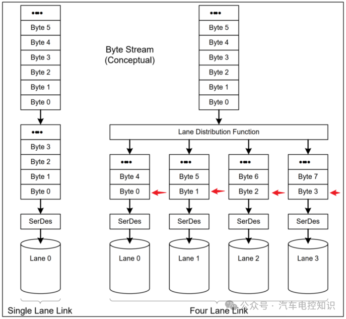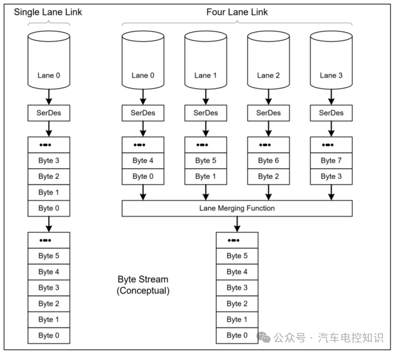 在接收端执行相反的操作,将 Lane上的数据整理打包成串行数据上报给上层: