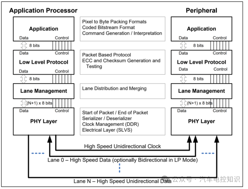 MIPI-DSI自上而下分为四层,依次为应用层协议层通道管理层物理层