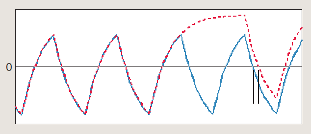 信号幅度的差异会带来什么问题呢?我们观察下图中的最后一个下降沿。当它从一个电平较高的逻辑1回到逻辑0(红色虚线),或者是从一个电平较低的逻辑1回到逻辑0(蓝色实线),下降沿的路径不一样了。这就导致下降沿过零点的时刻出现了不确定性,这就是抖动。这种抖动成分称之为DDJ或ISI。