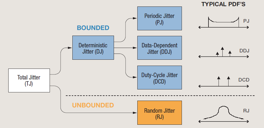其实基本思路非常简单,概括起来就是:抓大放小,对症下药!经典理论下,信号的总体抖动(Tj, Total Jitter)可以分成以下几类。我们通过示波器的抖动软件,测量出每种抖动成分的大小,将最严重的抖动成分降低,总体抖动就能降下来了。