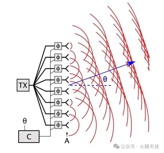 发射机的信号通过移相器发送到天线,移相器由计算机系统(相位控制器)控制,从而电子地改变相位,控制天线阵列的辐射模式方向。