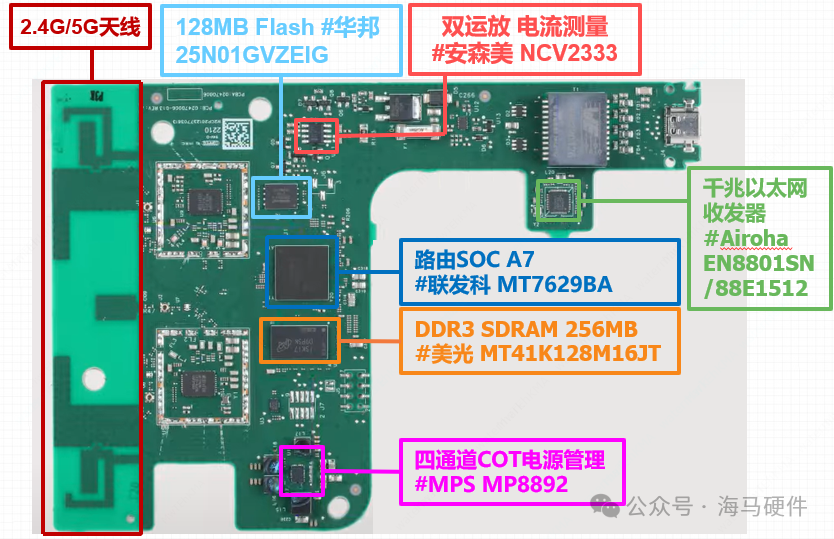 二代路由器的主板设计中,WAN口用于连接天线,采用SoC内置的以太网PHY,并且板上有POE元件。而外部的LAN口则由8801芯片提供PHY支持,板上没有以太网的POE元件。天线设计为3×3 MIMO,支持3发3收。