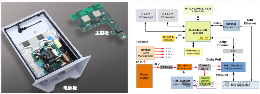 同样,星链Gen2也配有体积小巧的二代路由器,电源板有巨大的金属散热片。