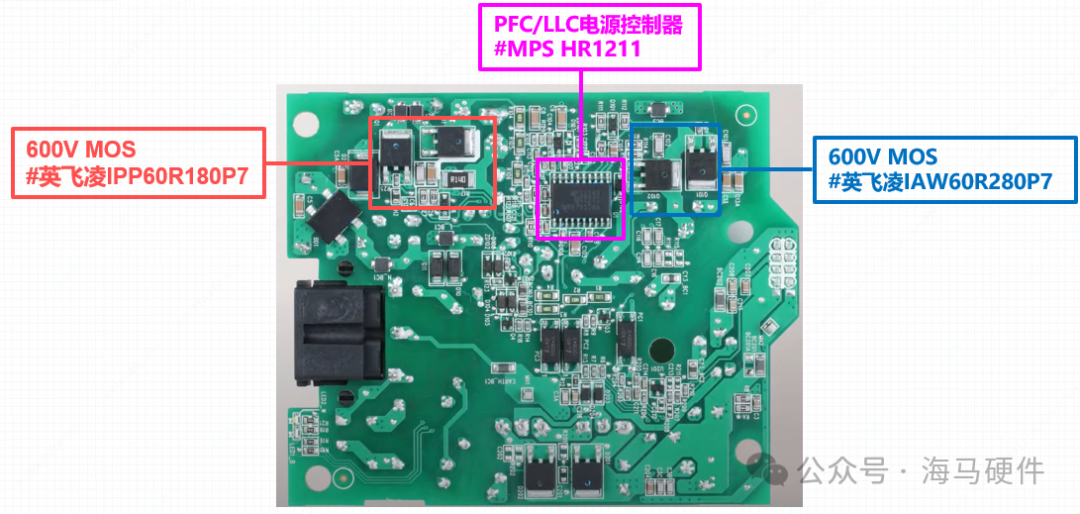 二代路由器的电源板负责AC/DC转换,提供两种电源:50V 2.4A的电源和12V 1.25A的电源。电源板使用的HR1211是一款多模式PFC和电流模式LLC组合控制器。