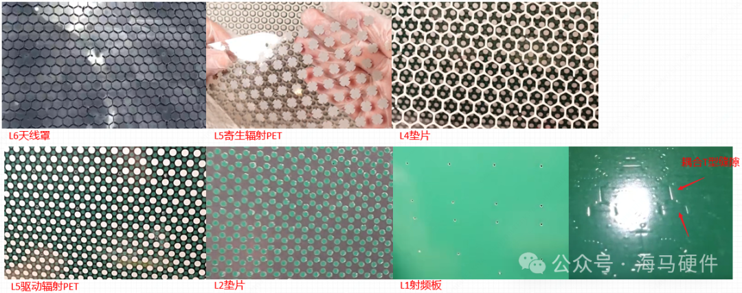 Starlink Gen2天线的结构分为六层,分别是L1的射频板、L2的塑料垫片、L3的驱动辐射层、L4的塑料垫片、L5的寄生辐射层,还有L6的天线罩隔离层。这里,辐射层是用喷墨打印的,塑料垫片是激光切割的,天线罩则是通过注塑成型做出来的。