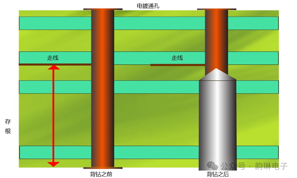 通过使用稍大的钻头,在电镀通孔制造后重新去除这些存根。将孔背钻到预定和受控的深度,该深度接近但不接触孔使用的最后一层。