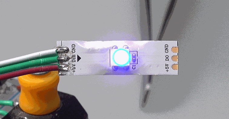 通过电路调整,选择了高频晶体管9018 作为输出反向晶体管,确定了放大电路参数,测试验证了利用高速SPI控制WS2812的硬件电路和软件。