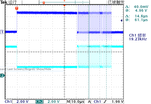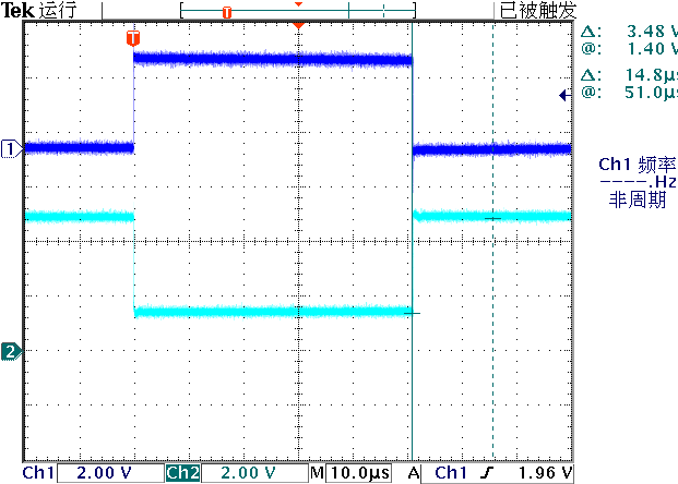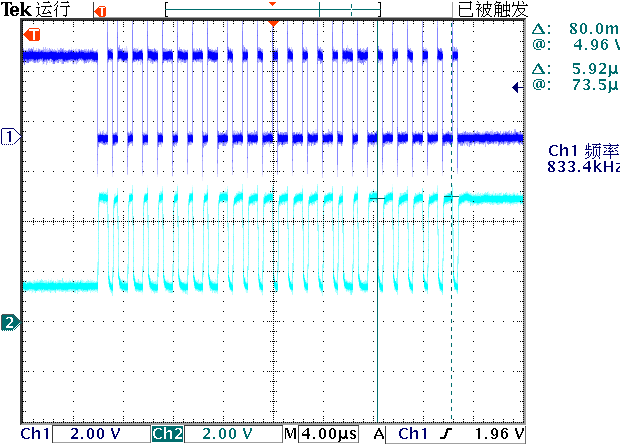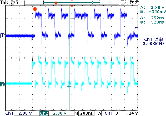 通过测试波形可以看到输出SPI的频率为5MHz。SPI正常的电平为低电平。