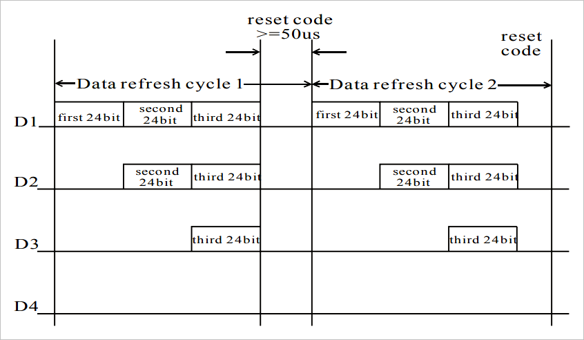 下面是三个WS2812级联发送过程对应的波形。可以看到通过发送三组24bit的编码,可以控制三个级联的WS2812灯的颜色。数据D1是直接由MCU数据端口控制,D2,D3,D4则是WS8212内部整形放大后再进行传输。