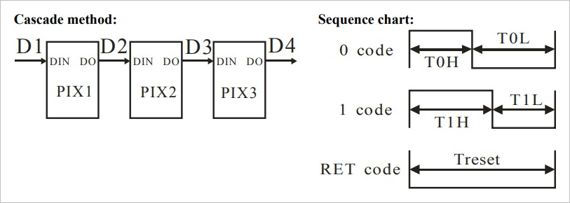 WS2812的级联控制协议非常简单。通过一根信号线就可以进行串行异步信号发送。