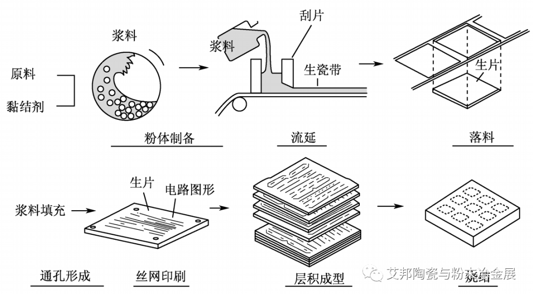 HTCC工艺和LTCC工艺基本相同,典型工艺流程包括生瓷带流延、裁片、冲孔、填孔印刷、叠片层压、烧制等。只是由于选用的材料不同而使得烧结工艺的不同。HTCC一般在1500°C以上高温烧结,而LTCC烧结温度一般在1000°C以下。除了共烧温度差别外,通常LTCC在空气气氛下共烧,而HTCC采用氢气气氛,保护W、Mo金属浆料不被氧化,对共烧气氛控制、工艺参数、金属浆料匹配、环保、安全生产、窑具和窑炉的维护维修提出较大挑战。