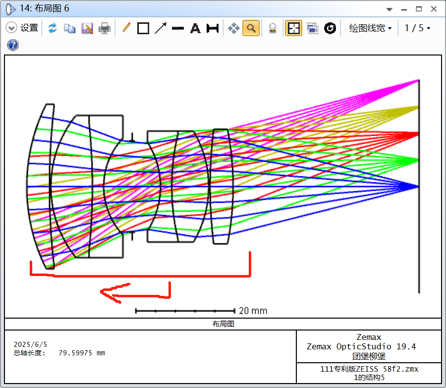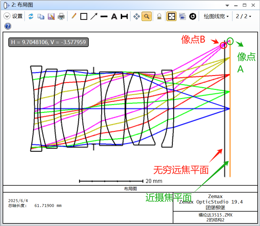 介绍:这是一款全画幅整组对焦的镜头,图中分别标明了 最近-最远的焦平面,以及近摄时COMS y=21.6mm处的像点A以及其反向延长线与无穷远焦平面的弥散斑像点B。