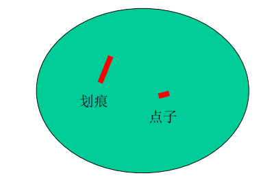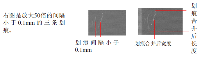 7、当两条或多条划痕之间间隔小于0.1mm时,划痕合并为1条计算,合并后的划痕长度从划痕开始到划痕结束,宽度取划痕的外边。