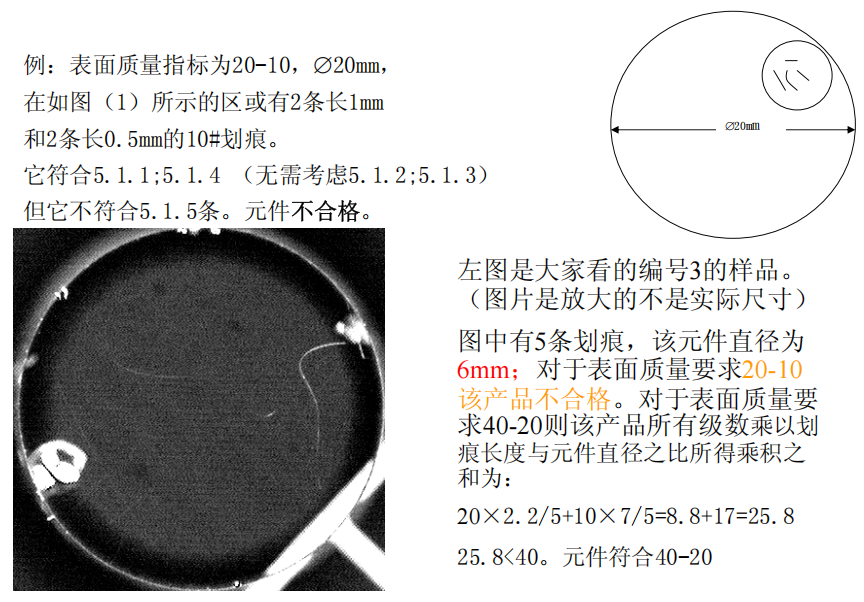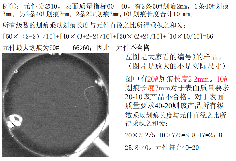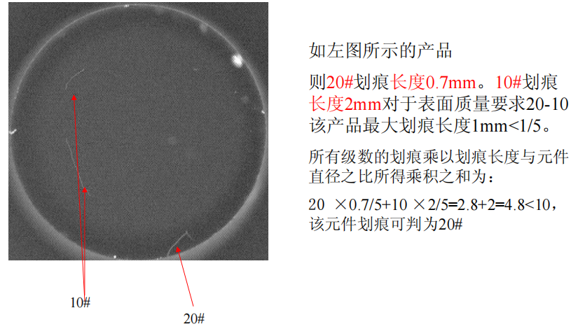 4、当元件的划痕级数未超过表面质量要求的级数,且元件不存在最大划痕时,所有级数的划痕乘以划痕长度与元件直径之比所得乘积之和,不得超过最大划痕级数。