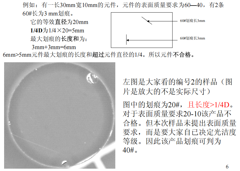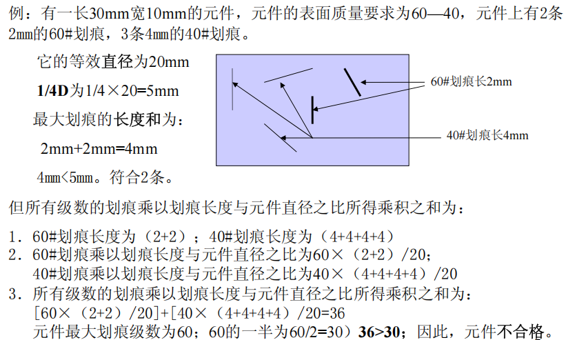 例如:元件的表面质量要求为60/40,则代表元件的划痕必须≤60#,如果元件有>60#的划痕,则元件不合格。